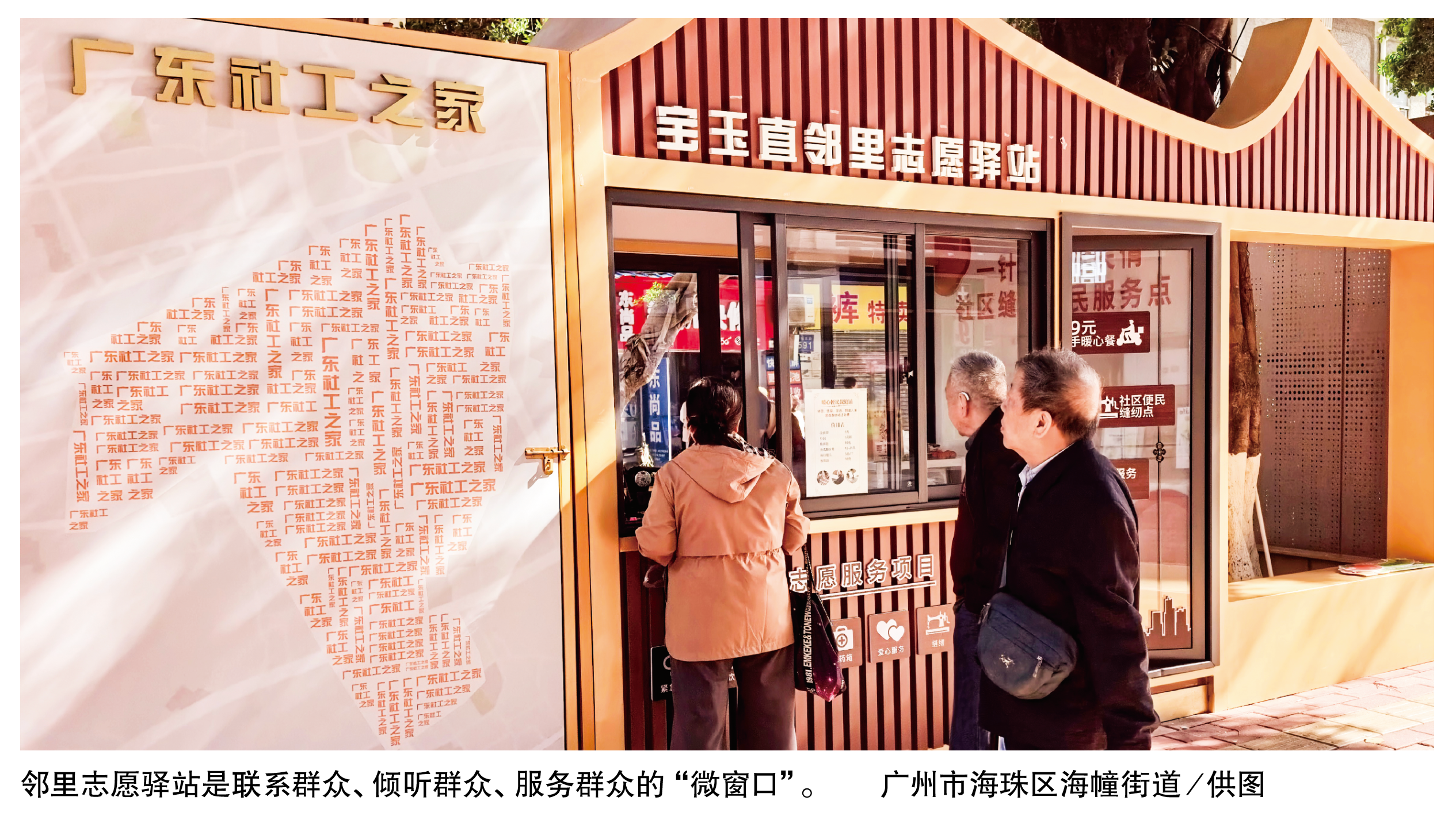 作为广东省村社区党群服务中心提质行动试点,宝玉直社区党群服务中心是全市首个实行“997”全时段(朝九晚九、一周七天)运营服务模式的党群服务中心。围绕居民多元化需求,中心做足“精”字文章,构建起“银龄关爱—青年成长—亲子共育”全周期服务体系。针对老年人,推出AI管家养老服务、“龄活大使”培训,让银发族乐享智慧生活;面向中青年群体,开设免费咖啡学堂全链条课程,手把手教技能、搭平台;针对家长们的“看护焦虑”,打造“海幢社区学堂”,让孩子有去处、家长少操心。而外延的邻里志愿驿站,更是联系群众、倾听群众、服务群众的“微窗口”,配备充电、加热、应急药箱等设施,还能第一时间收集群众的微心愿、微诉求,精准解决群众急难愁盼问题。驿站提供的9.9元骑手餐暖胃又暖心,“跑单累了,来这儿歇一歇,感觉自己受到重视。”外卖小哥王师傅如是说。